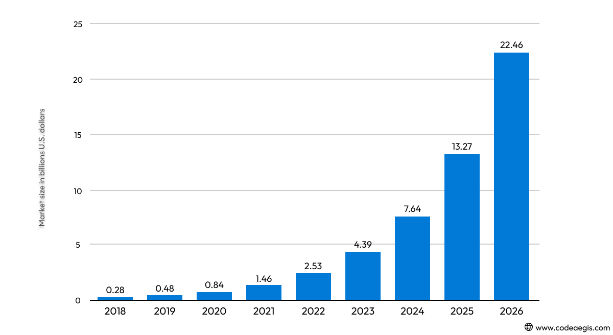 The estimated market size for blockchain solutions in the banking system and financial institutions was $0.28 billion in 2018. However, it is projected that the utilization of blockchain technology within the financial sector will experience significant growth in the coming years, with a forecasted market size of around $22.5 billion by 2026.