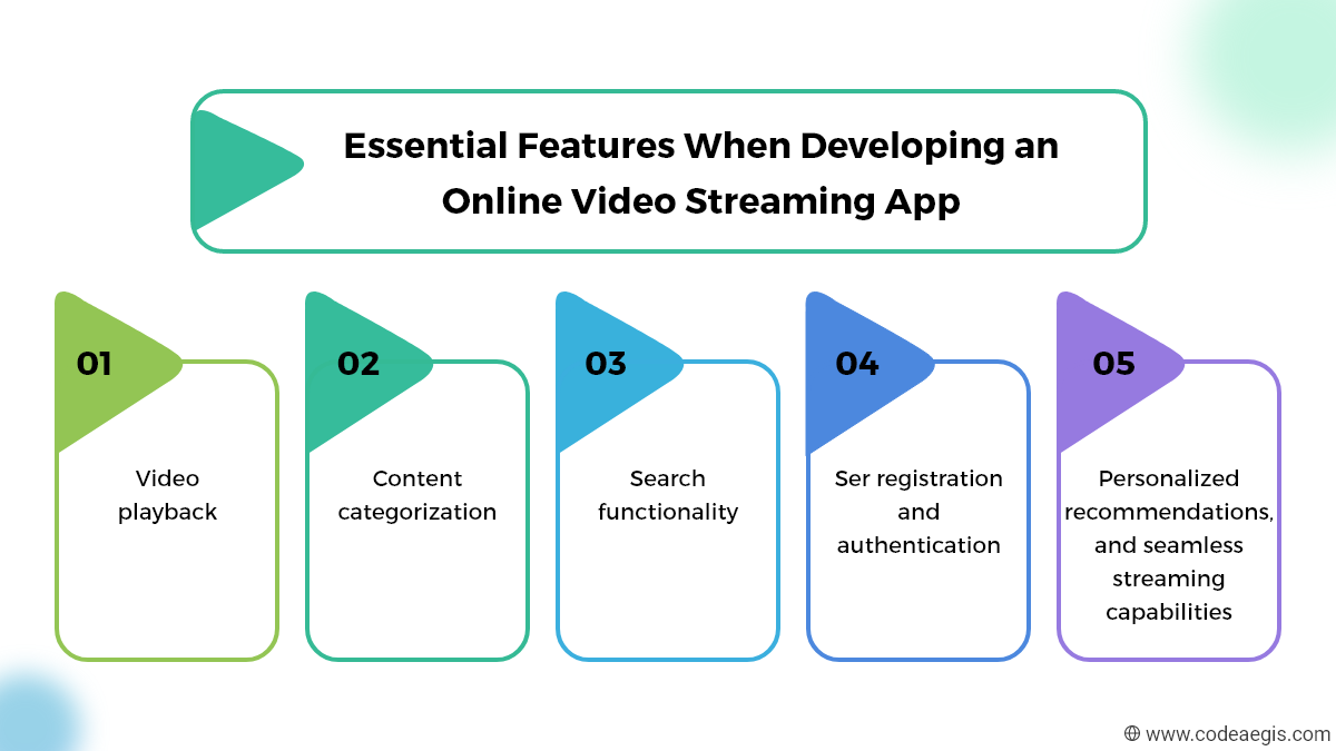 Essential features include video playback, content categorization, search functionality, user registration and authentication, personalized recommendations, and seamless streaming capabilities.