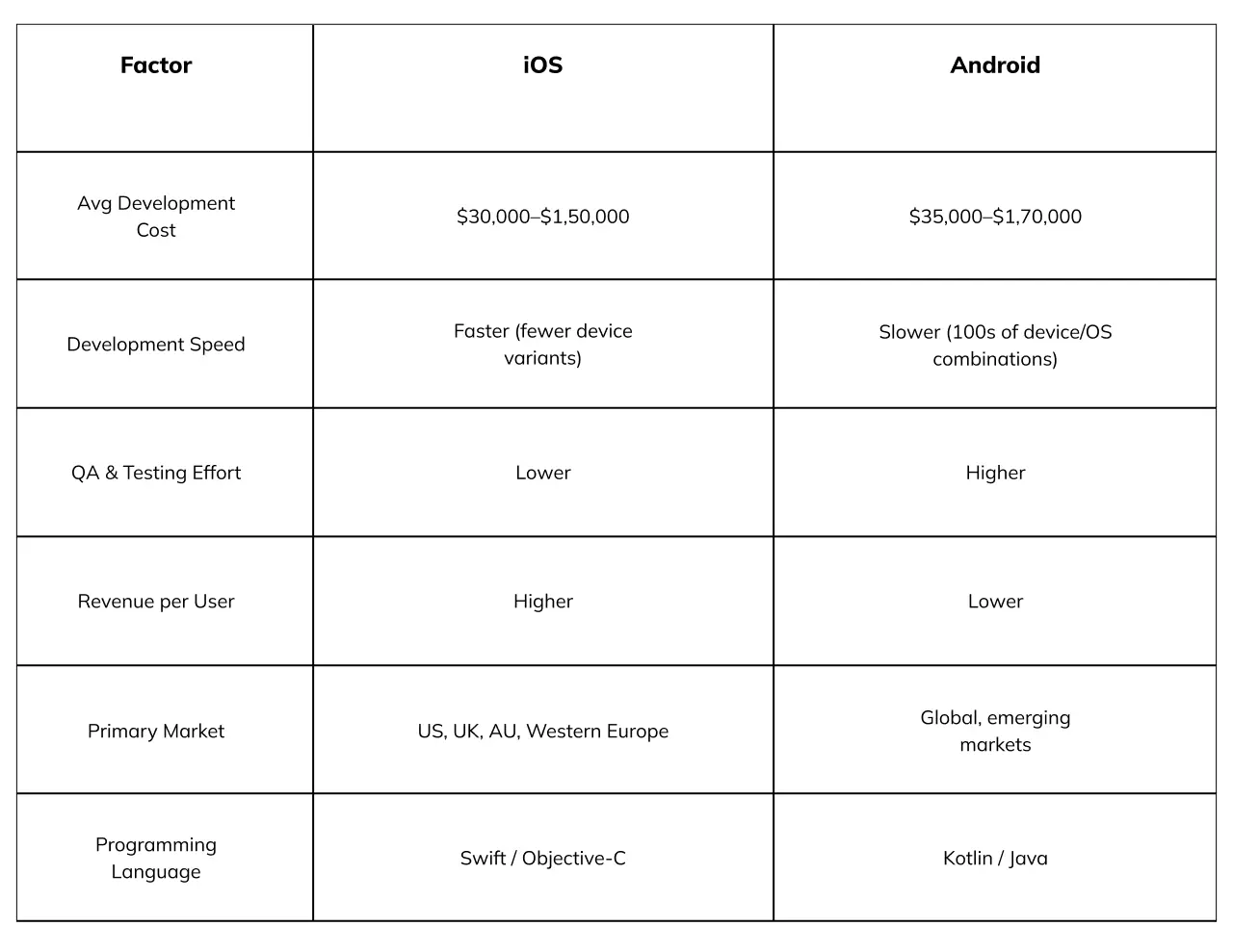 If your priority is speed, quality, and ROI, iOS is often the better starting point. Android becomes important when you want to scale globally across diverse markets.