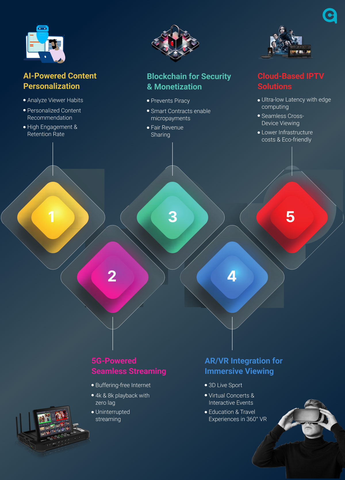 These advanced applications provide AI-Powered content personalization, 5G-Powered seamless streaming, blockchain for data security, AR/VR integrations, and cloud-based IPTV to explore the loaded benefits of tech services.