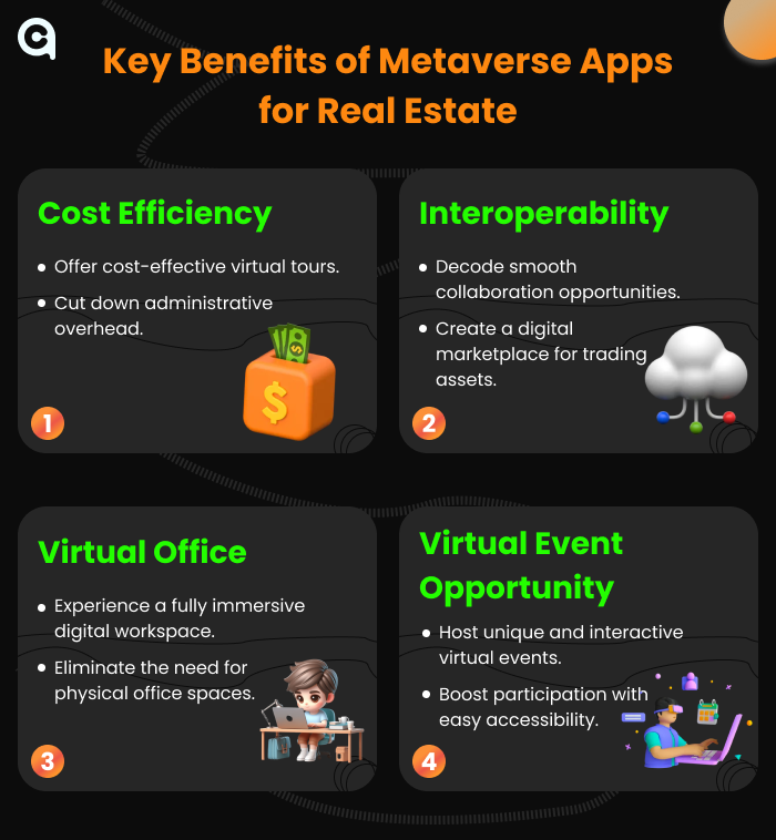 Cost Efficiency: Metaverse apps allow real estate businesses to reduce costs by removing the need for visiting at physical site visits and expensive marketing materials. Virtual tours, digital showrooms, and 3D modeling enable potential buyers to explore properties anywhere worldwide, reducing travel and administrative expenses.